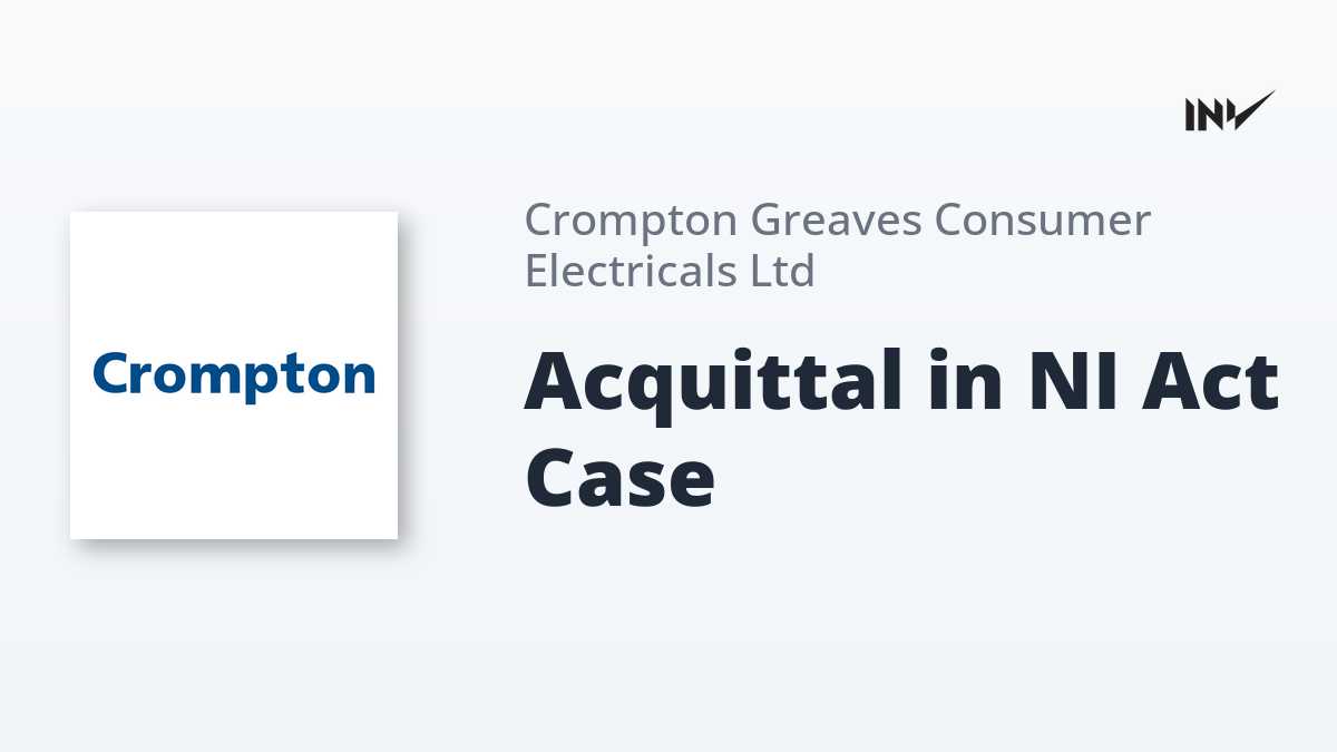 Company Update1 Min Read InvestyWise NewsonNovember 13, 2025 Crompton Court Acquits Company in Negotiable Instruments Act Case Crompton Greaves Consumer Electricals Limited (‘CGCEL’) has announced that the Hon’ble Court acquitted Mr. Satya Prakash…