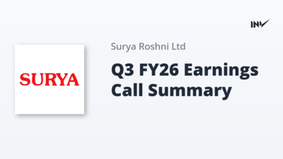 Company Update3 Min Read InvestyWise NewsonFebruary 17, 2026 Surya Roshni Limited Q3 FY2026 Transcript Highlights Stable Performance Amidst Volatility Surya Roshni Limited reported a 3% YoY revenue growth to ₹1,927 crores for Q3 FY2026, with EBITDA at ₹148 crores. While the Steel division…
