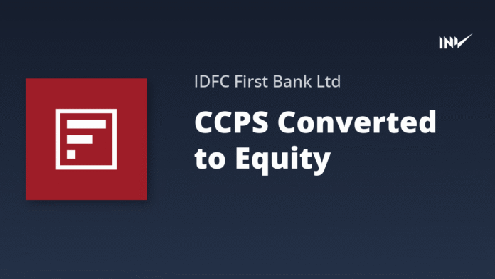 IDFC FIRST Bank has announced the conversion of compulsorily convertible cumulative preference shares (CCPS) held by Currant Sea Investments B.V. (“Investor”) into equity shares. The bank’s board approved the allotment of 81,26,94,722 equity shares, with a face value of ₹10 each, following the conversion. The board has also approved a dividend payment of ₹72,67,49,472 on the CCPS.