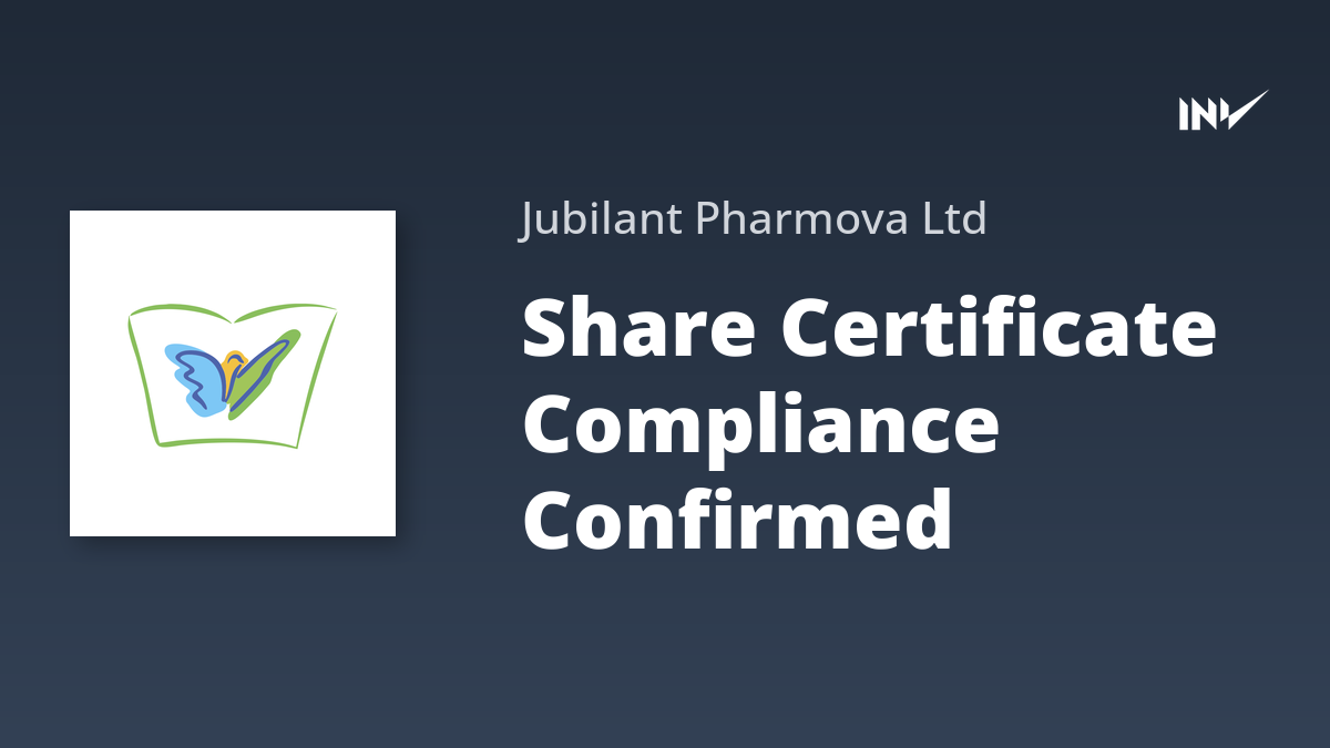 Jubilant Pharmova has received confirmation regarding compliance of share certificates for the fiscal quarter ending September 30, 2025 (Q2 2025). This announcement provides an update on the status of physical share certificates and their processing.