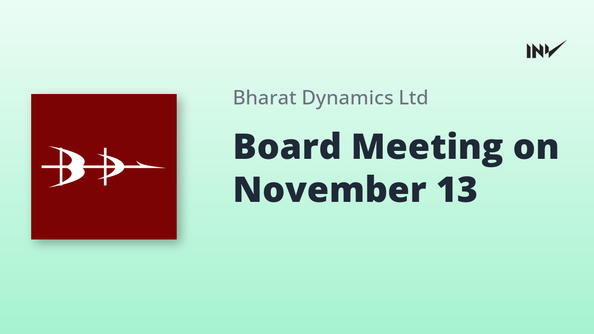 Board Meeting1 Min Read InvestyWise NewsonNovember 4, 2025 Bharat Dynamics Board to Consider Unaudited Financial Results on November 13, 2025 A meeting of the Board of Directors of Bharat Dynamics Limited will be held on Thursday, November 13, 2025, to consider and approve the…